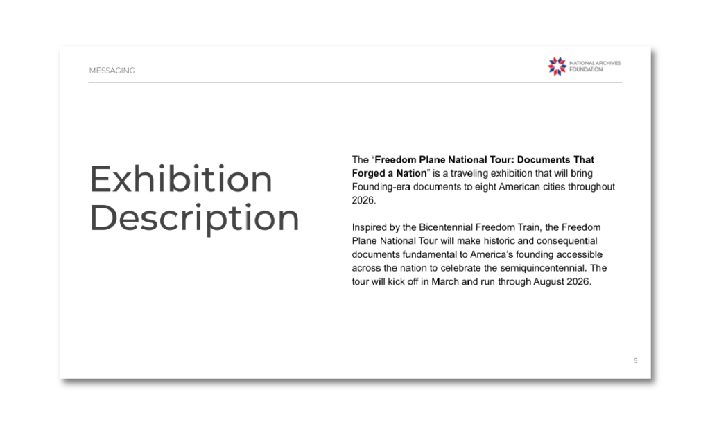 The “Freedom Plane National Tour: Documents That Forged a Nation” is a a National Archives traveling exhibition bringing nine original Founding-era documents to eight U.S. cities in commemoration of America’s 250th anniversary in 2026. Inspired by the Bicentennial Freedom Train, the Freedom Plane National Tour will make documents fundamental to America’s founding accessible to Americans across the country. For the first time ever, these documents will travel aboard a commemorative Boeing 737 in a custom “Freedom Plane” livery, bringing these pieces of history to communities nationwide.