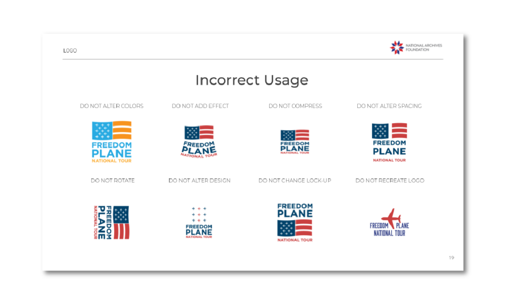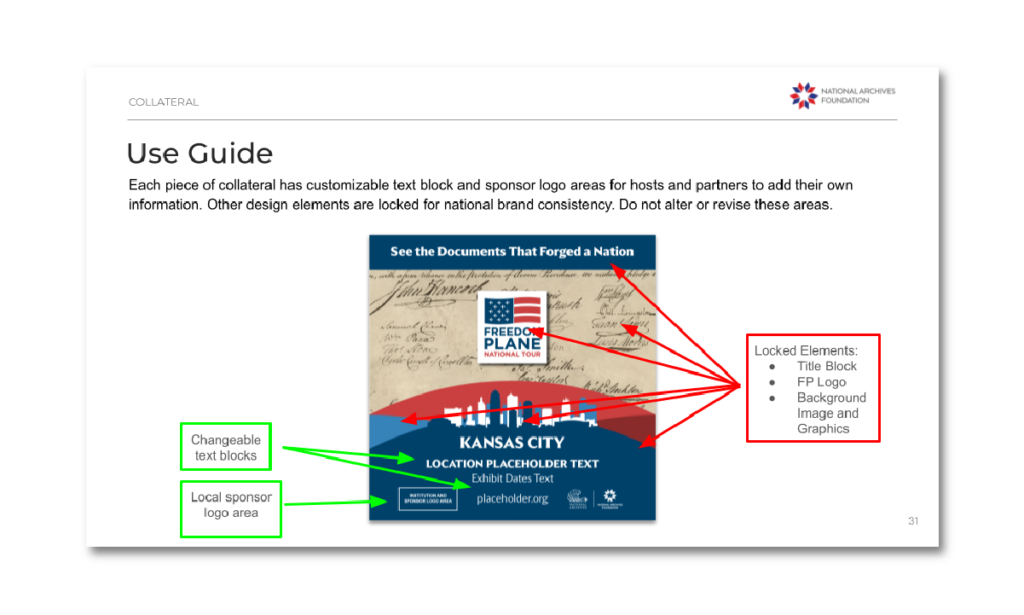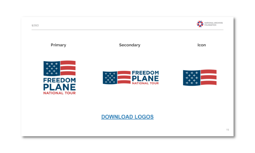 There are eight cities on the tour, each with a hosting venue having its own branded look and feel. We developed a set of brand standards to establish a consistent, national awareness of the Freedom Plane branding and marketing collateral templates that allowed each venue a degree of customization within that architecture.