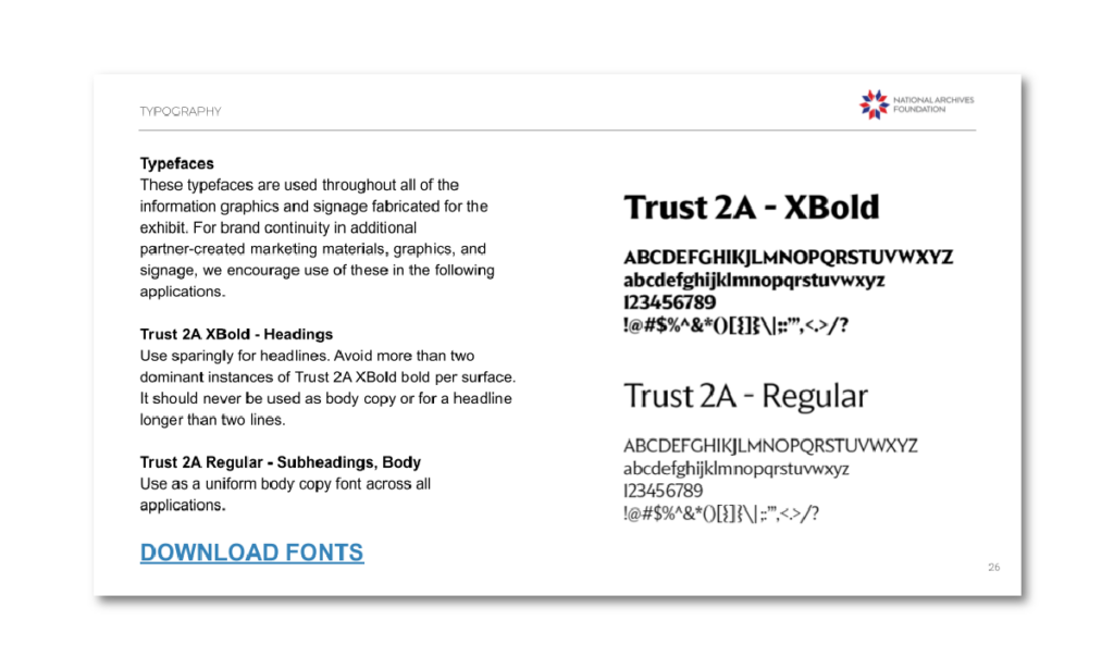 Inspired by the historic Bicentennial Freedom Train, we created an identity capturing the semiquincentennial’s monumental scale. We began with a mnemonic logo reimagining the American flag, replacing its stars with thirteen airplanes to encapsulate the tour’s unique transit and the original colonies. It is bold, patriotic, and commanding, instilling national pride while remaining approachable for diverse audiences. Anchored by a deep, authoritative navy blue, our colorway features confident dark red and crisp white accents. These evoke a modernized Americana that translates seamlessly onto a massive Boeing aircraft livery. Finally, the Trust 2A typeface family gave us a commanding typographic identity, monumental headline impact, and high legibility across all exhibition graphics.