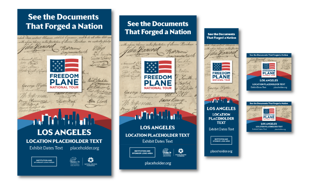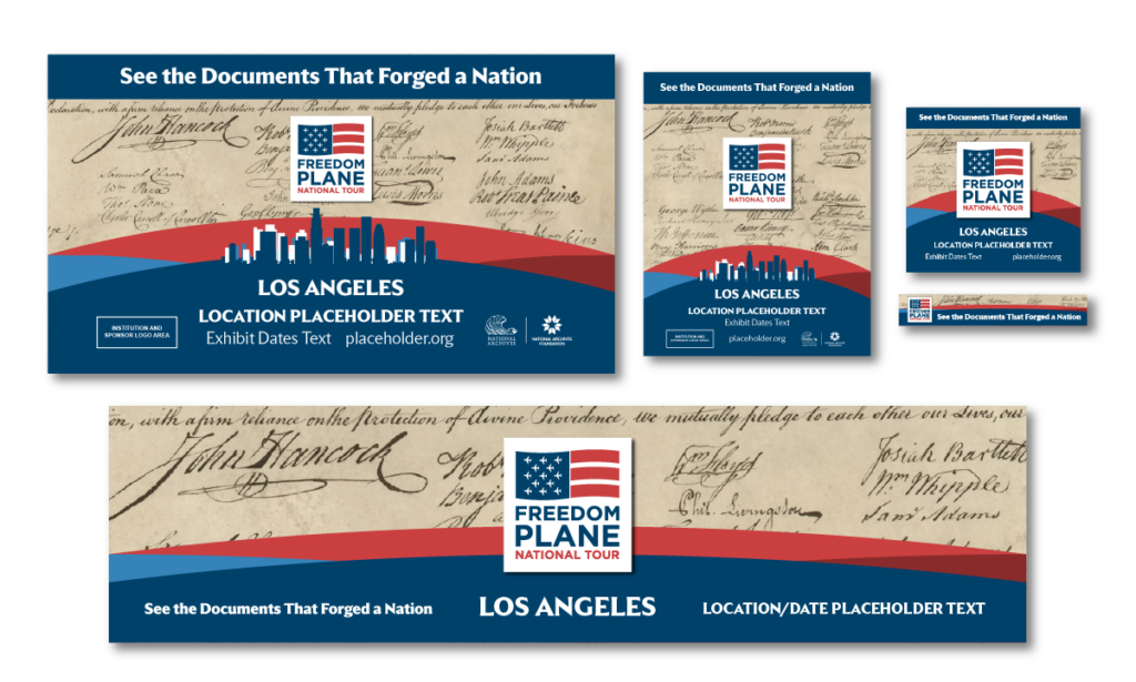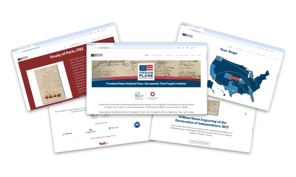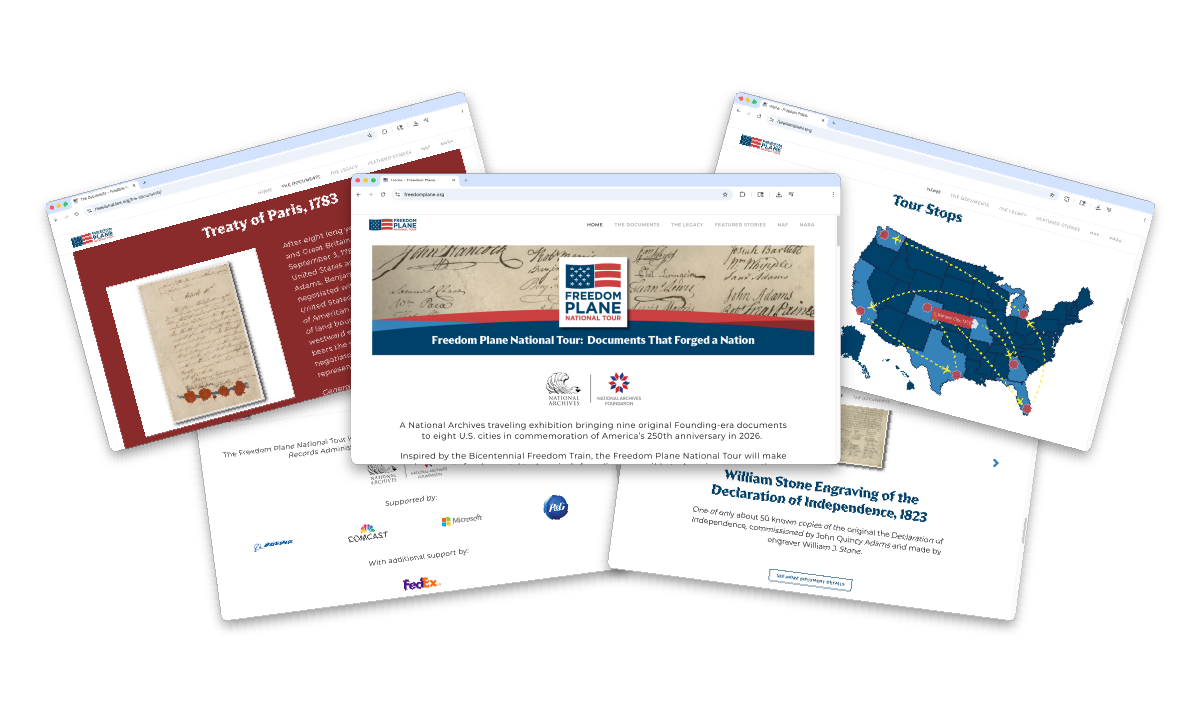 To celebrate America’s 250th birthday of the Declaration of Independence, the National Archives and the National Archives Foundation created the “Freedom Plane National Tour.” A specially outfitted Boeing 737 flew some of the nation’s most valued documents around the country for display exhibitions in eight cities. Figure originated the branding and a launch campaign across multiple platforms.